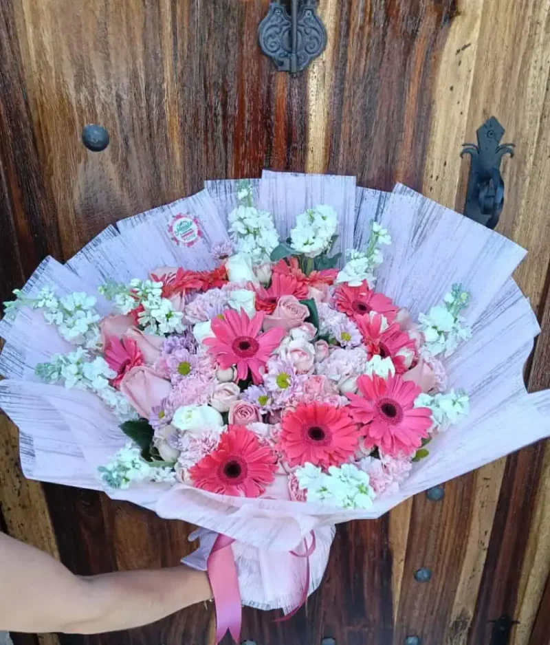 11 gerberas, 12 rosas rosas, 6 rosas blancas, 10 claveles, 4 varas de mini rosas, 3 varas de anat, 10 varas de mattiola