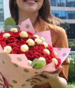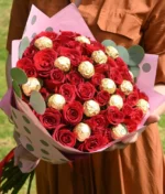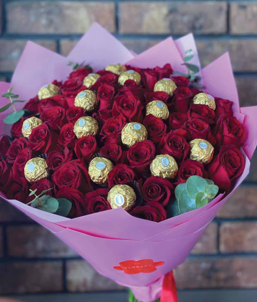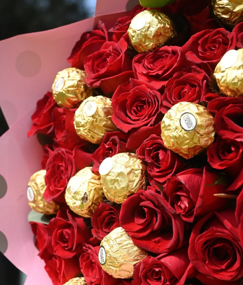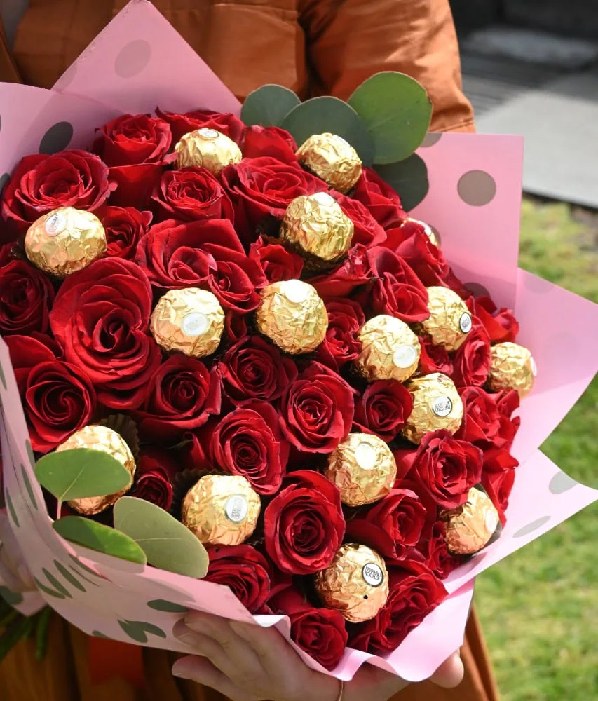 Hermoso Ramo de 50 rosas rojas con Chocolates ferreros > flores frescas del alta calidad > Incluye dedicatoria > Flores a domicilio
