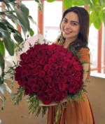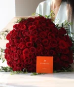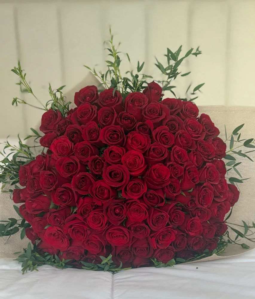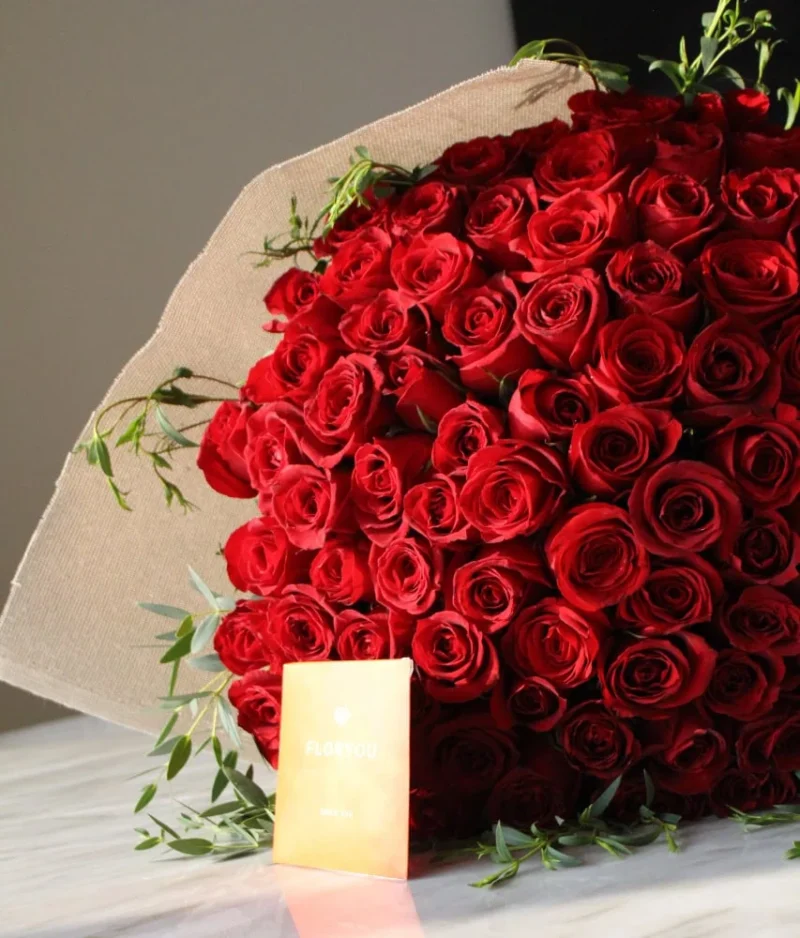 100 rosas rojas, Detalles de Eucalipto, Envoltura de yute o papel coreano