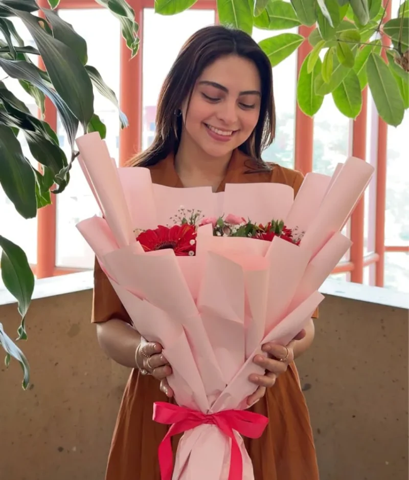 Hermoso Ramo 4 gerberas rojas, 6 rosas rosas, 12 claveles rosas y follajes